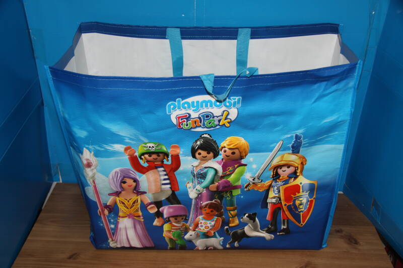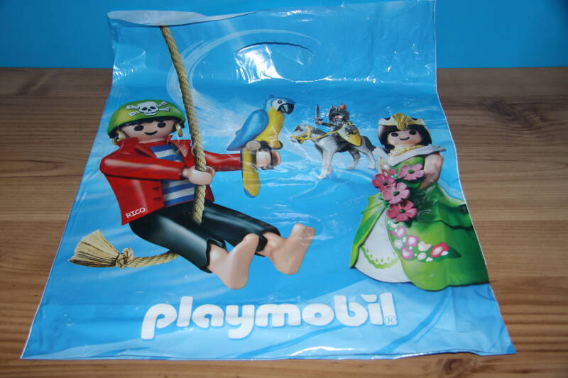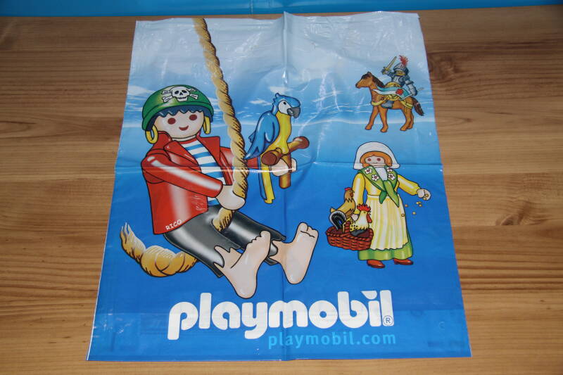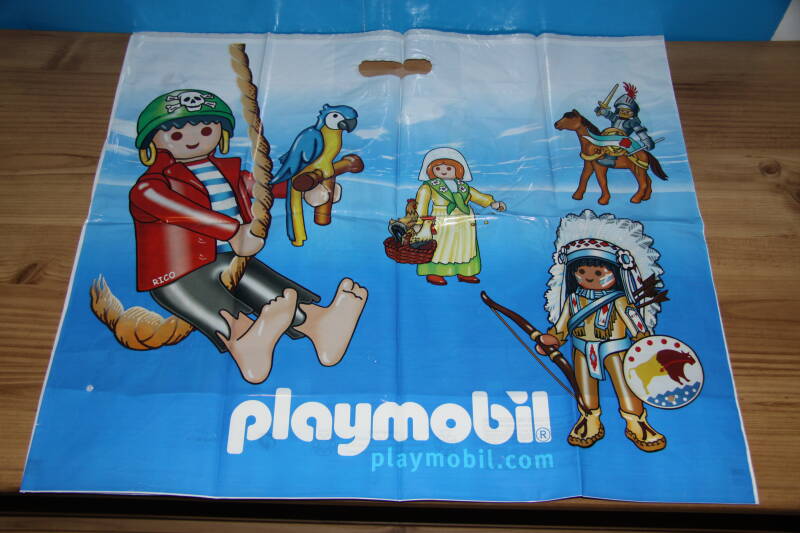 Playmobil heeft zelf natuurlijk in de loop der jaren veel tassen, voornamelijk plastic wegwerp, laten maken en deze meegegeven bij de koop van artikelen uit de shop bij de verschillende parken. Ook in sommige speelgoedwinkels waren ze voorzien van deze plastic tassen, maar helaas wat meer mondjesmaat. Een aantal van deze tassen zijn in mijn trots bezit en hieronder te bewonderen.